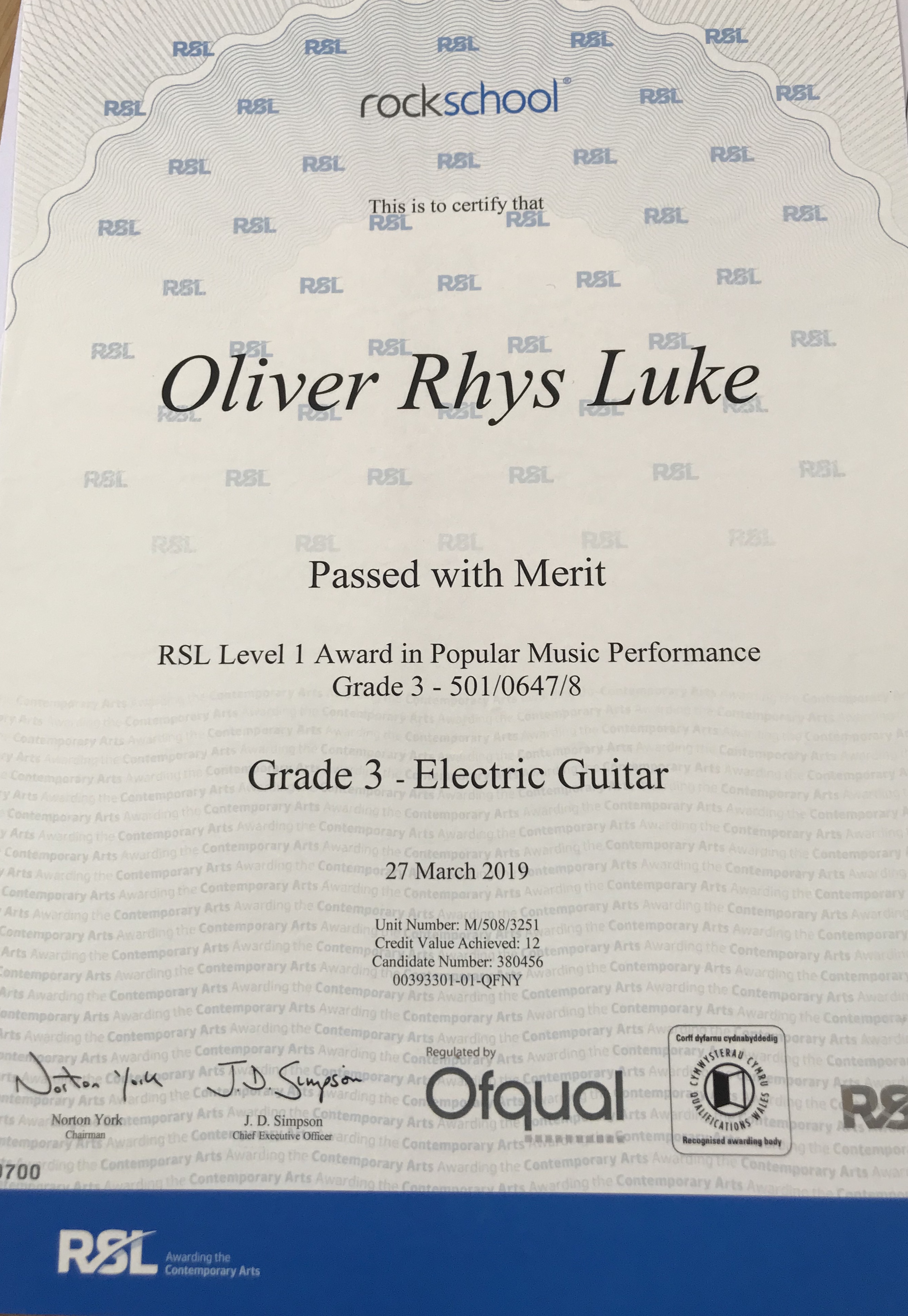 On March 27th 2019 I took my first guitar exam. It was the Rockschool grade 3 exam in electric guitar. For the exam I had to learn 3 songs, 4 scale as well as doing sight-reading, melodic and rhythmic recall and answer general musicianship questions.